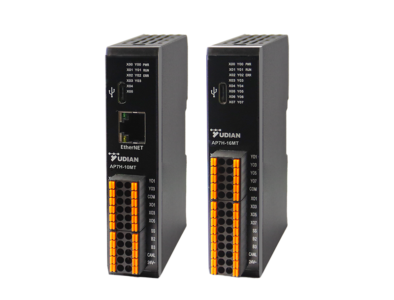AP7H-16MT:8 点输入,8 点输出可编程控制器,RS485(2 路),CAN,高速输入 4 路 100KHz,高 数输出 3 路 100KHz(并发时三路总输出频率最大为 150KHz)。